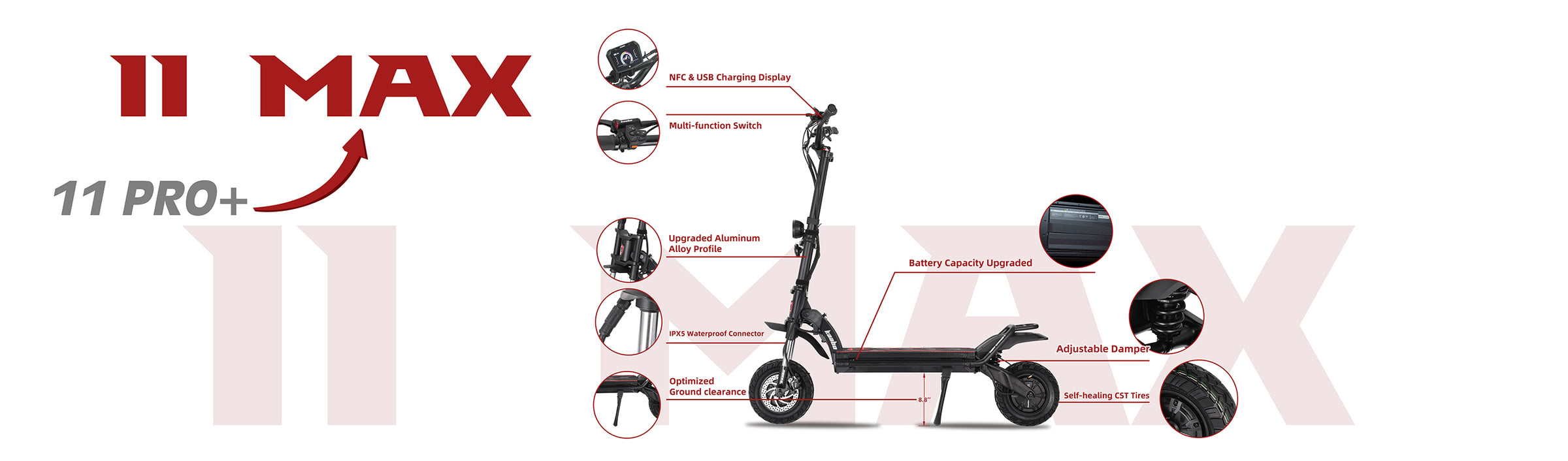 The front sports hydraulic suspension, while the rear features anall-new spring systemtuned for responsive, rugged performance. Whether you’re navigating rocky trails or bouncing through urban potholes, the 11 MAX eats shocks for breakfast and delivers a smooth, controlled ride every time.